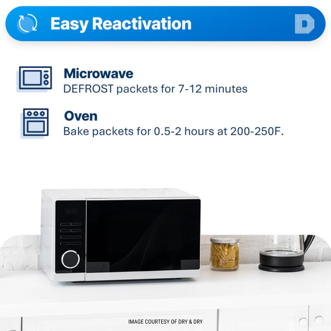 These packets can be recharged in a microwave or conventional oven. This means they can be continuously redried and reused.  For detailed recharging instructions click here.
